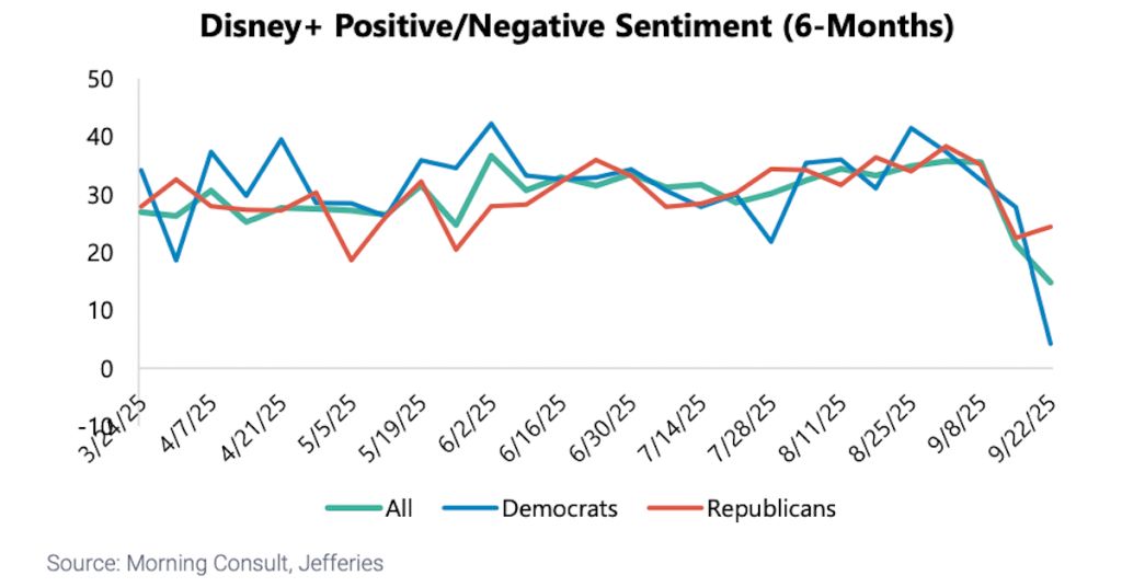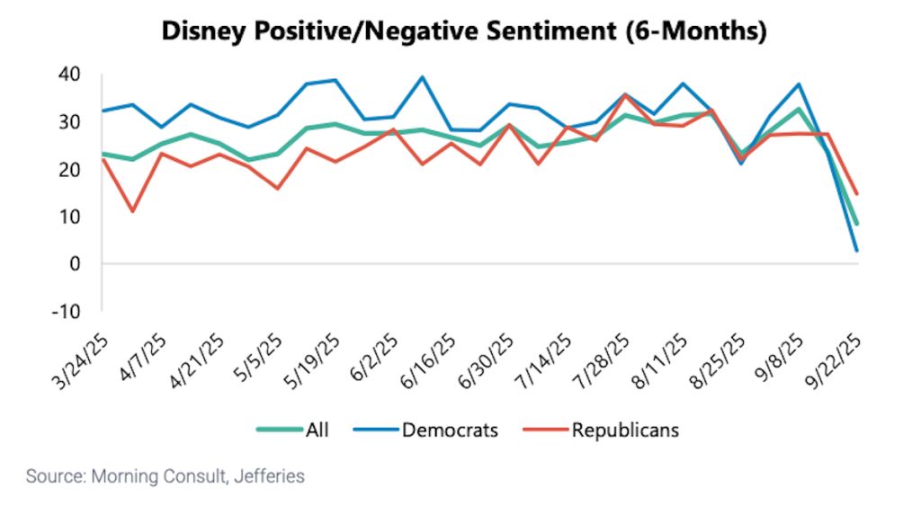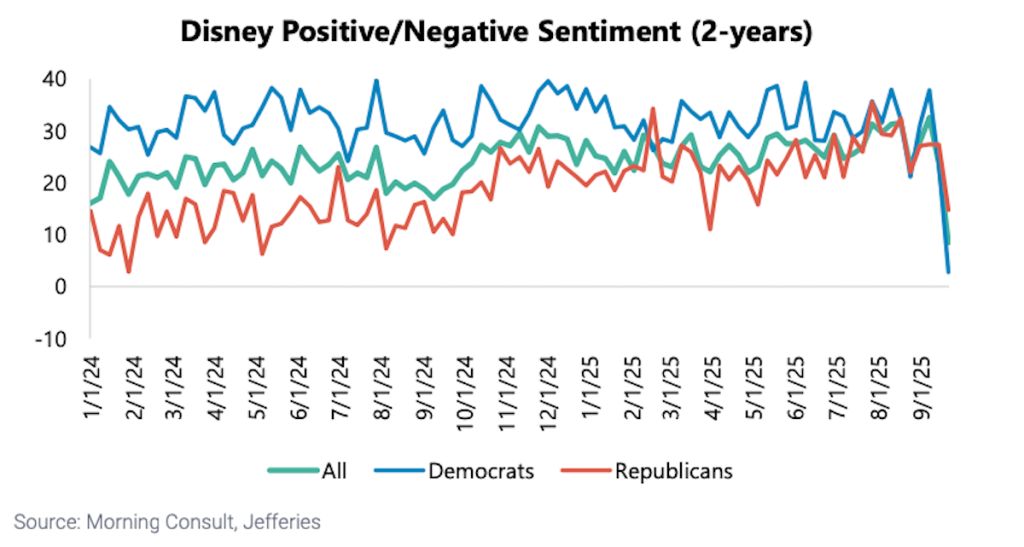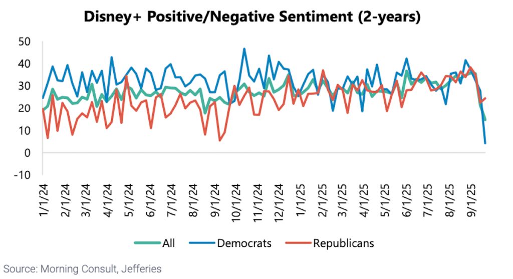 Consumer sentiment around The Walt Disney Company and Disney+ has plunged following the temporary suspension of “Jimmy Kimmel Live!” and news of upcoming streaming price hikes, according to an analysis by investment bank Jefferies.