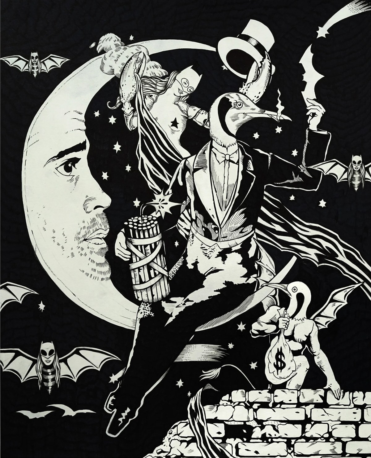 Born and raised in Los Angeles, Nehemiah Cisneros developed a deep appreciation for the art of comics at an early age. Cisneros naturally gravitated to Colin Farrell’s performance as the title character in HBO Max’s The Penguin. “Art is fiction, just like a TV show,” Cisneros says, noting that both filmed work and visual art thrive on spontaneity and improvisation. Cisneros, a 2024 MFA graduate of UCLA who likes to weave layers of symbolism into his work, gave Batwoman lobster hands—a nod to Farrell’s 2015 film The Lobster. Cisneros has already earned a place in some prominent collections with an artistic style heavily influenced by 19th-century illustration, especially the etchings of William Hogarth. Reflecting Batman’s nocturnal nature, Cisneros chose to portray Farrell as the moon, the central light source throughout the limited series.