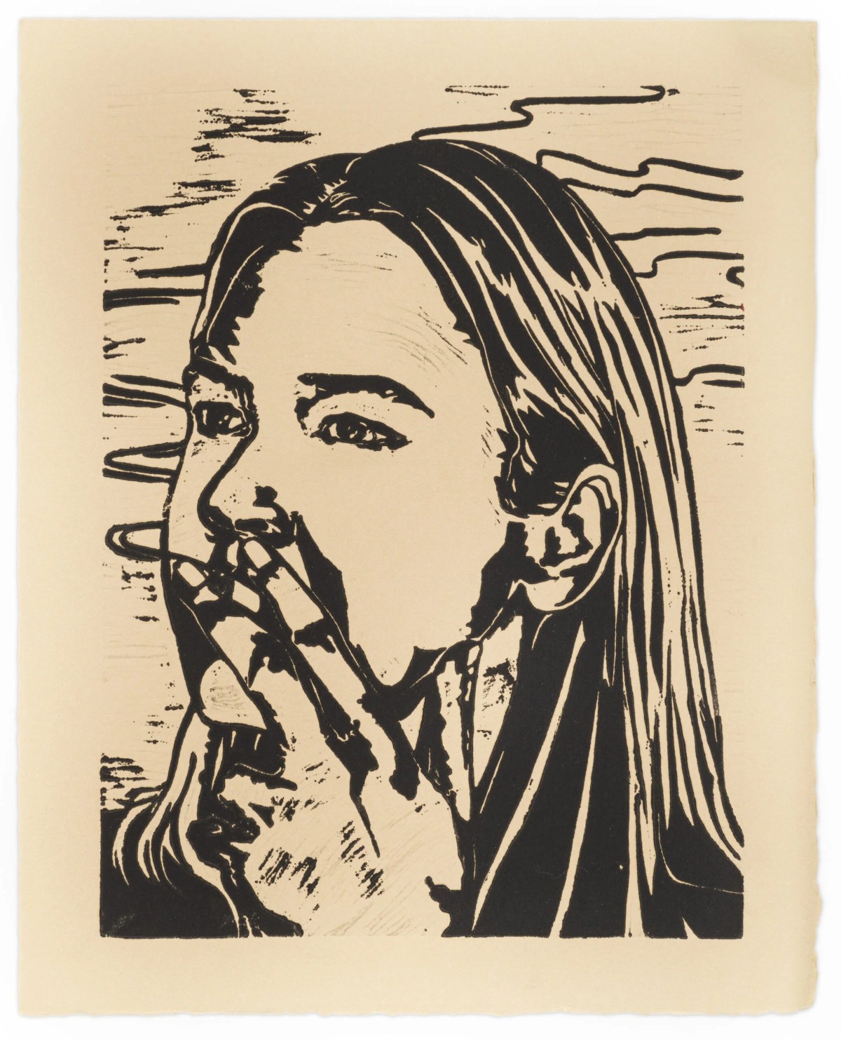 Tidawhitney Lek has long been an admirer of Renée Zellweger’s films, Chicago in particular. To capture the actress’s return to playing the perennial singleton Bridget Jones for a fourth time in the Peacock movie Bridget Jones: Mad About the Boy, Lek depicted the character smoking one of her guilty-pleasure Silk Cuts. “I perhaps chose this image subconsciously as I used to be a smoker,” says Lek, who continued her exploration of linoleum printmaking for the work. Lek, an artist of Cambodian descent who maintains her studio in L.A. but continues to reside in her hometown of Long Beach, has work in the permanent collections of LACMA, Perez Art Museum, ICA Miami, K11 Foundation, Museum of Contemporary Art San Diego and Columbus Museum of Art.