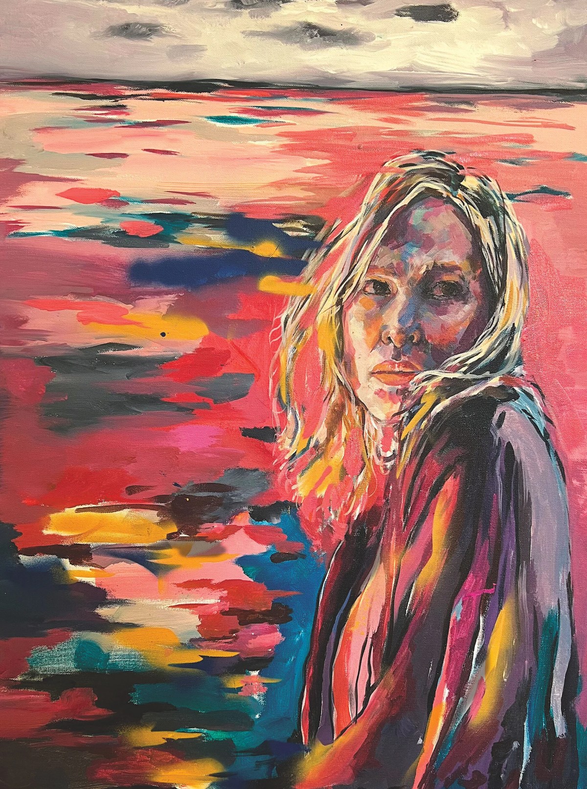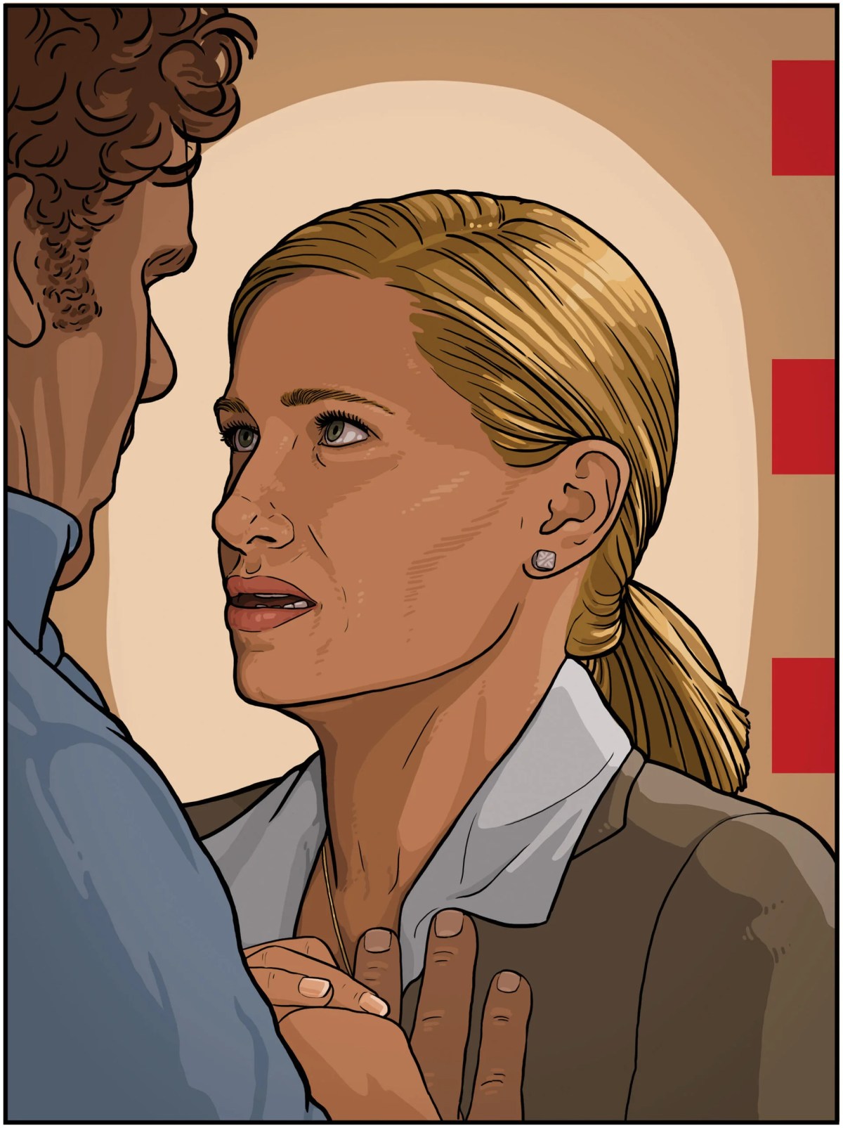 Los Angeles-based artist-educator Delbar Shahbaz based this piece, Because I’m the Mother, on a pivotal moment in Disclaimer when Cate Blanchett’s character is confronted by her husband about her many lies. Shahbaz captures Blanchett’s inner turmoil with thick, expressive brushstrokes. “This work is a portrait of feminine strength and moral complexity—a tribute to all mothers who silently carry the weight of love, fear, and protection,” Shahbaz says. The idea resonates with the Iranian native, who has had to search for a new home and studio since losing everything in the Altadena fires earlier this year.