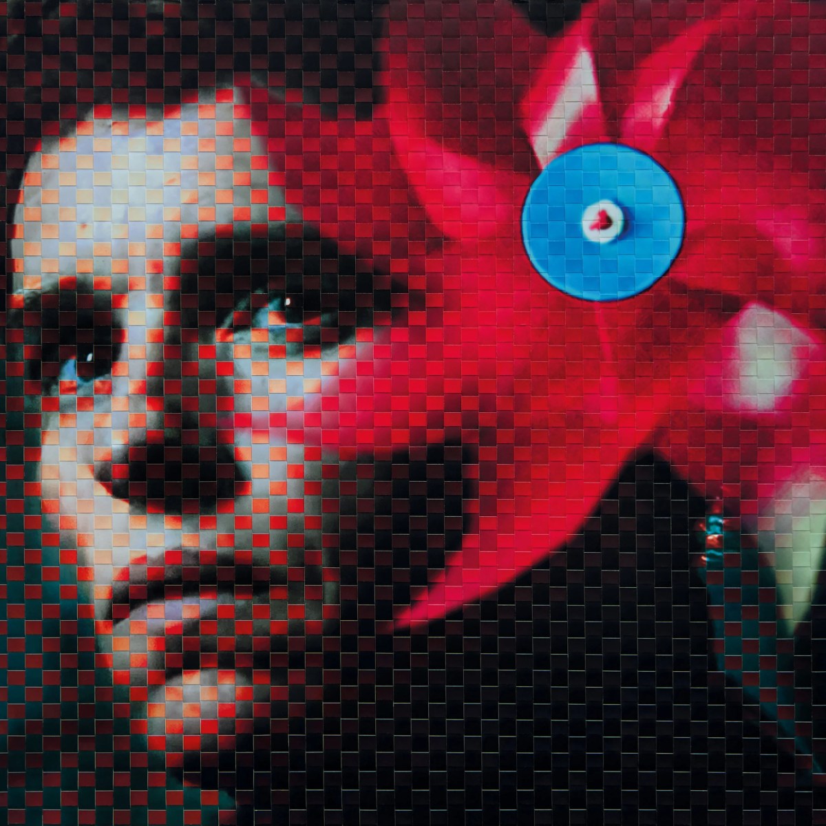 between her meticulous artistic process, the precision of actor Eddie Redmayne’s performance in The Day of the Jackal and the calculated nature of the actor’s assassin character. To capture this duality, Ji Oh hand-wove two color renderings of the character’s face, skillfully blending digital manipulation with traditional techniques on a wooden panel. The result blurs the line between actor and character, truth and illusion. A pinwheel, an innocent-looking yet deadly tool of Redmayne’s assassin characcter, appears like a flower in his hair, adding irony and intrigue.
