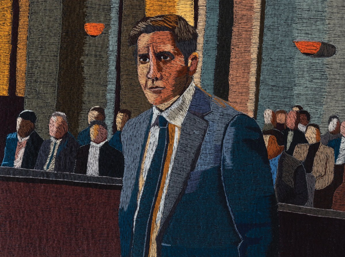 While Erick Medel usually depicts working-class immigrants in his work, here the L.A.-based artist captured Jake Gyllenhaal as a well-heeled lawyer defending himself on murder charges in the Apple TV+ limited series Presumed Innocent. Medel created the work entirely on denim, a fabric closely associated with laborers and rarely seen in courtroom settings. This choice was intentional, underscoring the tension between identity and environment. Born in Puebla, Mexico, Medel immigrated to the U.S. at the age of 13. His work can be seen at Charlie James Gallery in L.A.