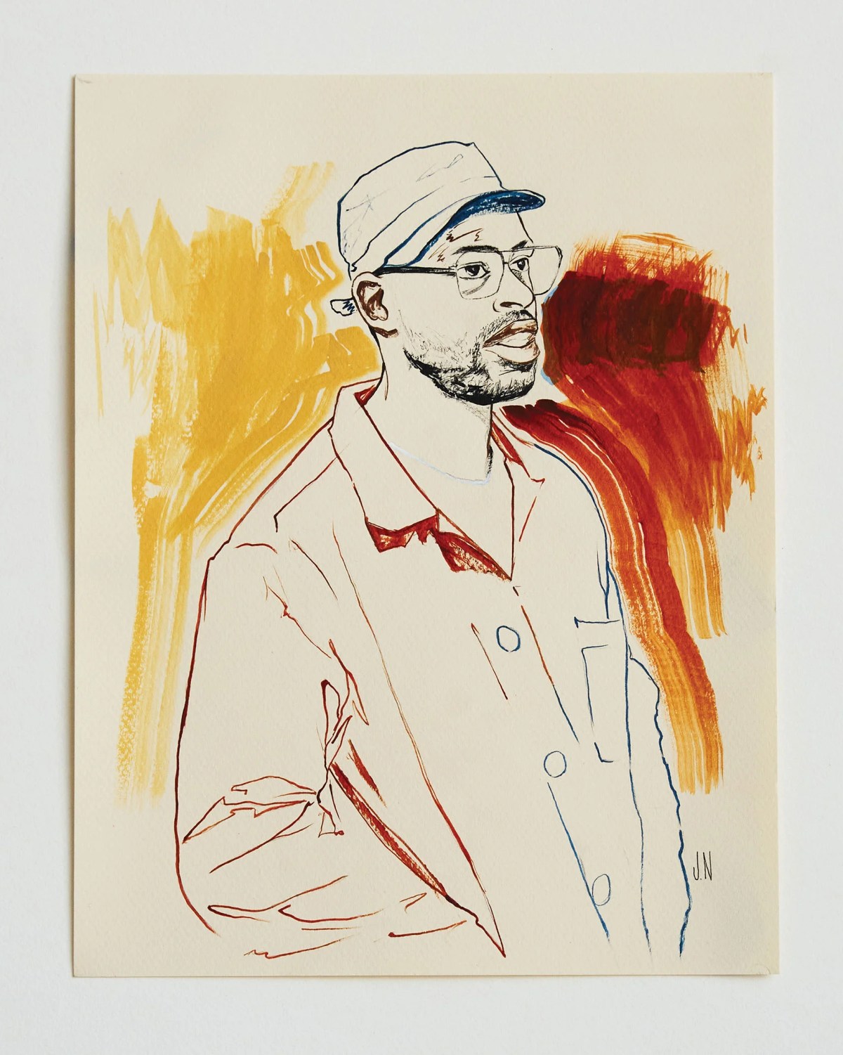 Jasaya Neale opted for a casual, candid portrait of Sterling K. Brown in the Hulu drama series Paradise rather than a more formal look at his character in his Secret Service uniform. As a result, Neale used loose outlines and expressive brushwork while still capturing a cinematic quality. “Depicting Sterling K. Brown was no coincidence—he’s from the same state as me,” Neale explains. Both artists hail from Missouri and share an affinity for jazz culture. Neale, an L.A.-based artist and model, was born and raised in Kansas City and has Afro-Caribbean Trinidadian roots. His artwork often merges with his modeling; he has collaborated with brands such as Jacquemus, Levi’s, H&M and Drake’s Diary.