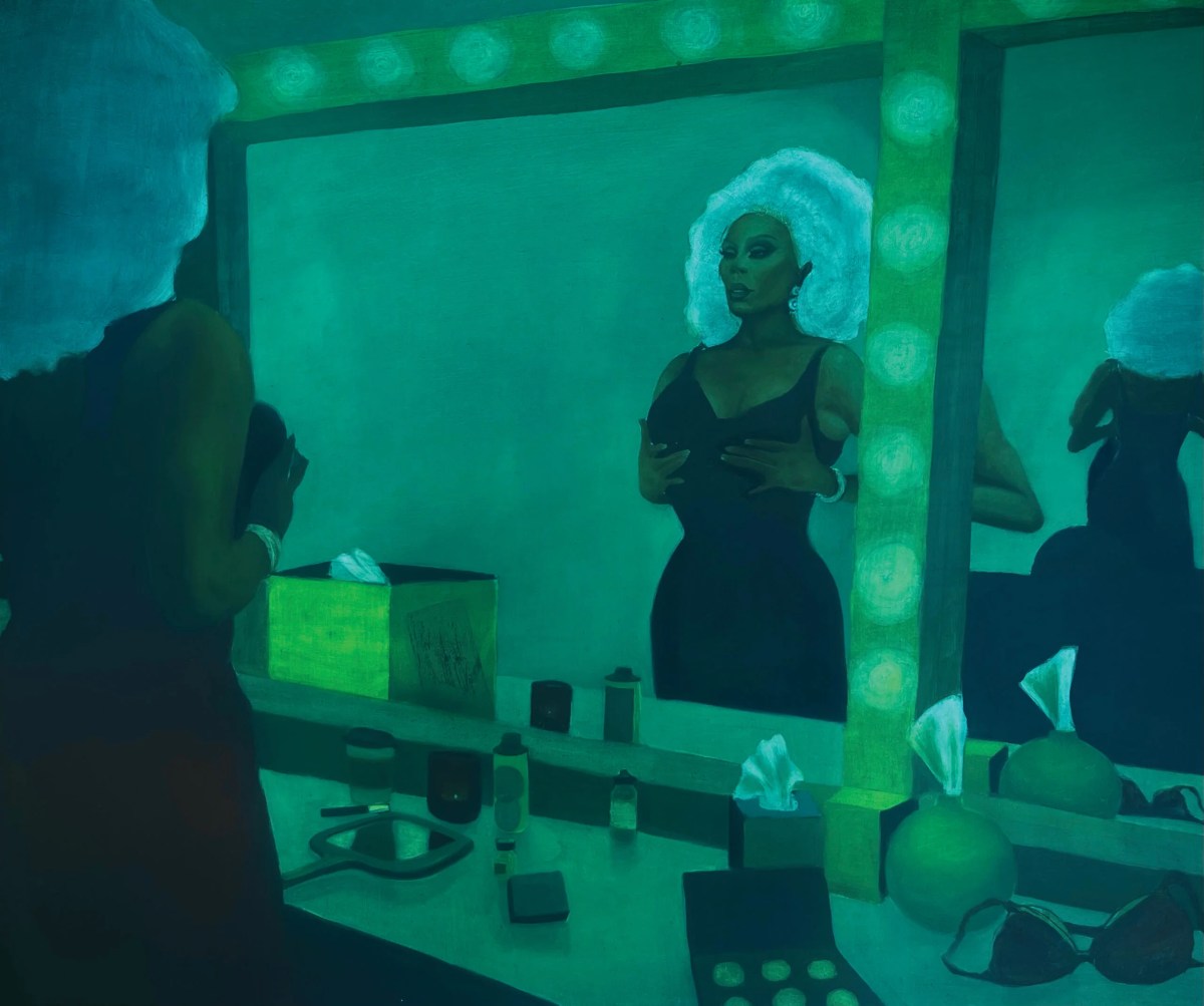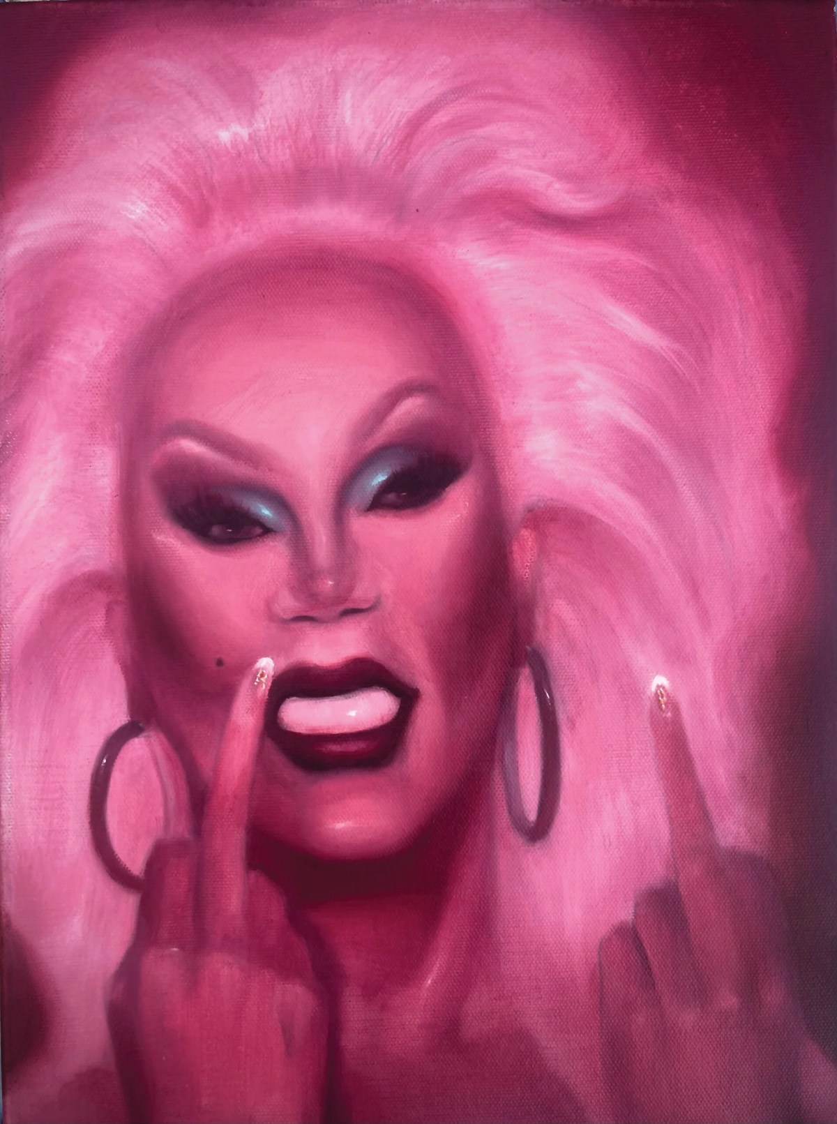 Emiliana Henriquez is a passionate admirer of RuPaul, drawn to the drag icon’s fierce spirit, willingness to take risks and undeniable talent. Inspired by RuPaul’s complex persona, she created a diptych to explore the duality between the star’s public image and private self. “All artists need to create a persona, because not everyone deserves to know who you really are,” Henriquez says. In a bold homage to Lisa Yuskavage’s iconic The Fuck You Painting, she includes a defiant middle finger in her own piece. “No post or painting should be censored,” she says. “Just like RuPaul, we’re trying to be sassy and confident—especially in order to stand out in the art world.” Born in El Salvador and raised in Los Angeles, Henriquez plans to embrace a nomadic lifestyle over the next year, aspiring to become a true citizen of the world and inspire other Latin indigenous artists.