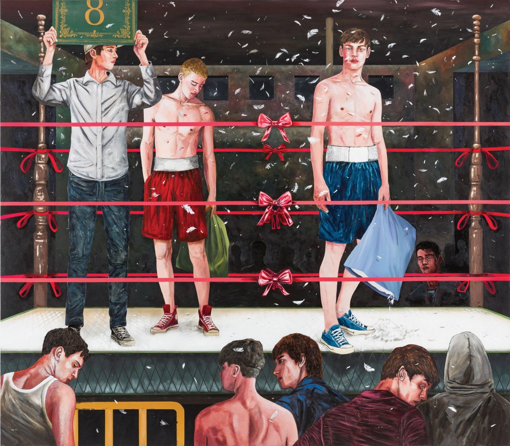 In “The Conceptualists” series featured in this portfolio, Bas depicts young artists obsessively engaged in conceptual art practices, confronting and reinterpreting art historical influences. For example, “Conceptual artist #16 (Performance based; the founder and reigning champion of a weekly pillow fight tournament)” references George Bellows’ famous boxing paintings. Instead of reinforcing traditional ideas of masculine aggression, though, Bas replaces the typical boxing scene with two boys engaged in a pillow fight on a mattress ring decorated with ribbons.