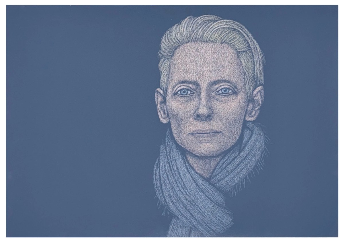 Amy Adler’s work shows Tilda Swinton as Martha in Pedro Almodóvar’s film “The Room Next Door.” “Swinton is captivating in this role as an experienced, elegant, and determined woman who faces her own vulnerability,” said Adler. The Los Angeles-based artist’s background in film, photography and drawing coalesce in this image, resulting in a portrait that blurs the boundaries between art and cinema.