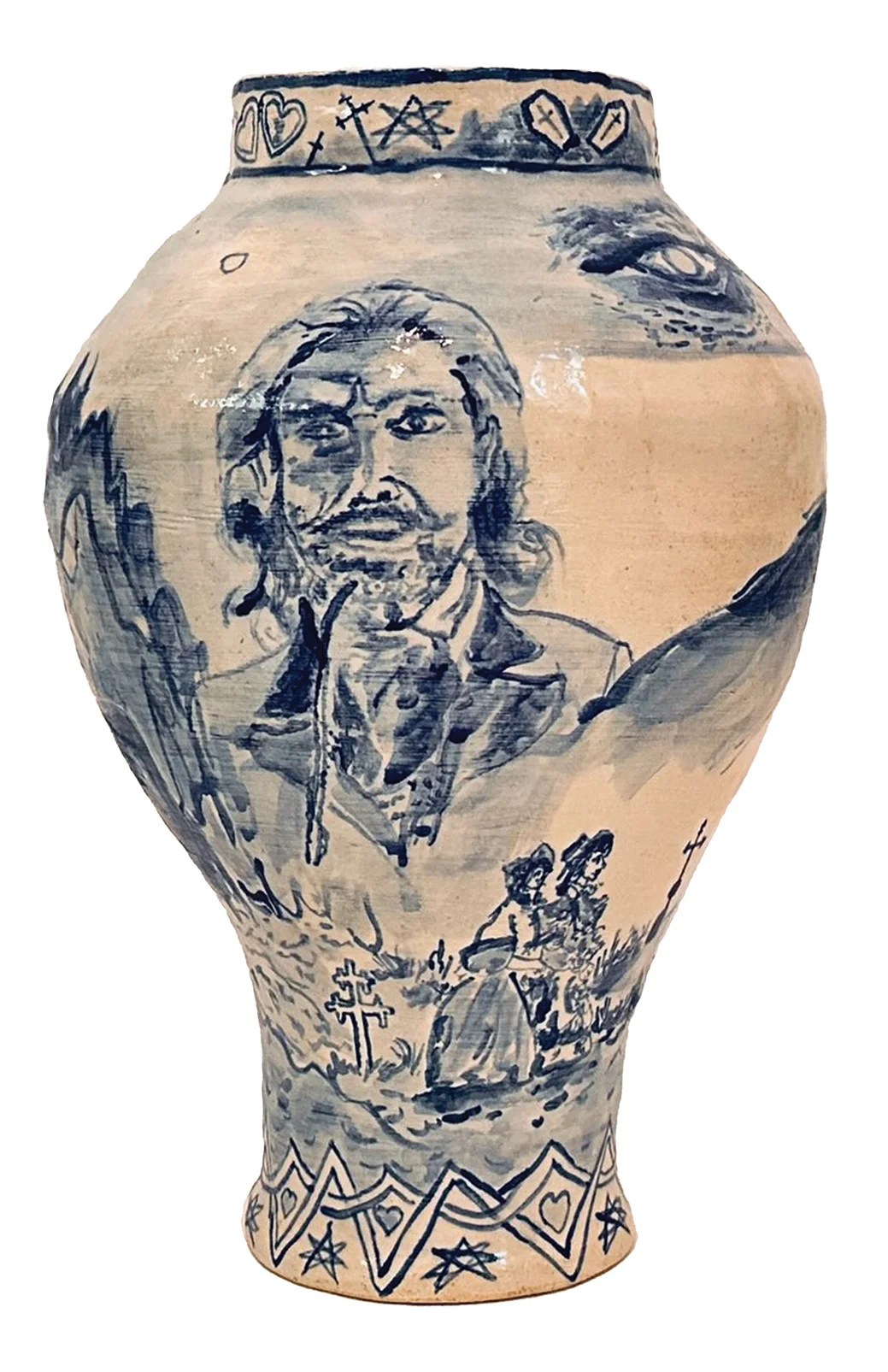 Eduardo Sarabia is renowned for incorporating symbols of northern Mexico landscape and contemporary culture narratives into his artwork. “Growing up in the 1980s, Demi Moore was the actress, hence I chose to depict her,” said Sarabia, who was invited by José Noé Suro Ceramics to visit his studio in Guadalajara, Mexico, to learn more about the process of making ceramics. Although initially planning to stay for three months, he ultimately decided to stay in Guadalajara permanently.