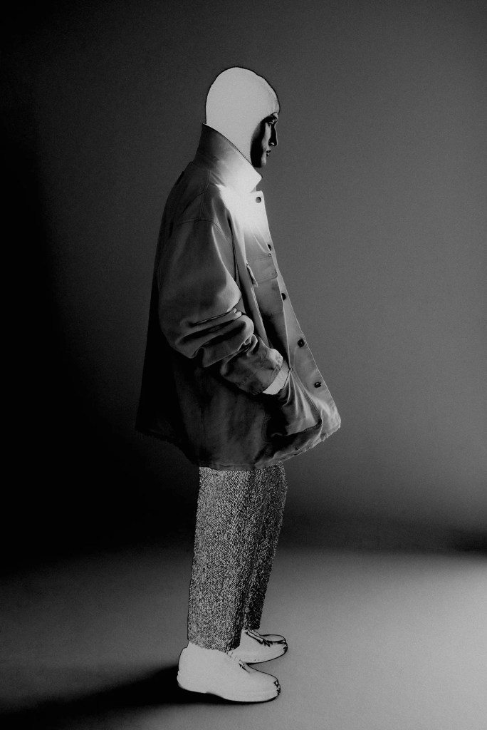 Ben wears sweater, pants, boots and belt, all by Giorgio Armani and sunglasses by Gentle Monster.