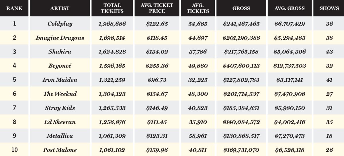 Pollstar’s Top Ten Worldwide Touring Artists ranked by ticket sales through Q3 2025 hit an array of genres and in total grossed $2.02 billion, up 12.7% from the $1.80 billion earned by last year’s top 10. Coldplay’s “Music of the Spheres” continues to put the bar higher as it approaches 2 million in ticket sales this year. Followed closely by Imagine Dragons, Shakira and Beyonce, who interestingly toured primarily in different markets: Europe (Imagine Dragons), Latin America and and North America (Shakira) and North America and Europe (Beyoncé).