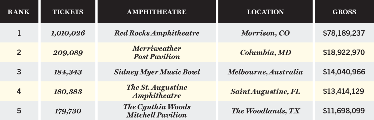 The stunning Red Rocks Amphitheatre in Morrison, Colorado, a national treasure is also a perpetual chart topper, again crowning the amphitheater survey with more than 1 million tickets sold and a gross of $78.2 million, far more than any other shed.