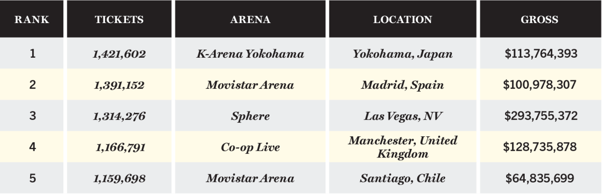 The top five arenas by ticket sales include Yokohama, Madrid, Las Vegas, Manchester and Santiago are even more international than stadiums. With Japan’s K-Arena Yokohama topping Q3 with 1.42 million tickets sold. Madrid Spain’s Movistar Arena (formerly the Wizink Center until this year) follows closely with 1.39 million tickets and Las Vegas’ Sphere with 1.31 million.