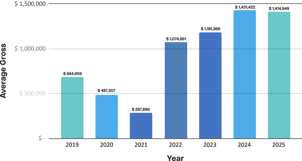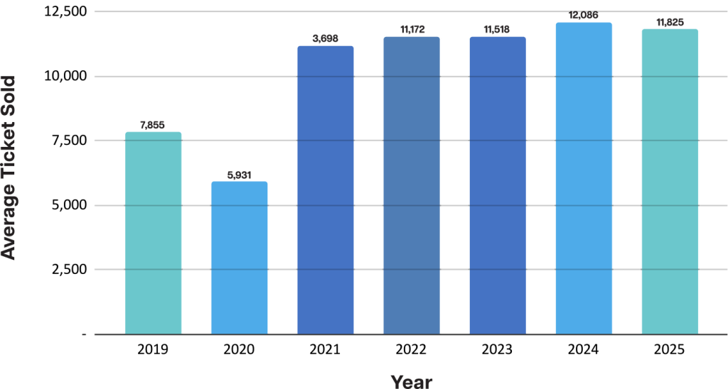 For 1,501-2,500 capacities, 2025’s average ticket count of 1,457 is less than one percent lower than last year’s 1,460, but it is 7.23% less than 2023’s 1,571 average. Likewise, the gross average of $81,800 is only 0.6% lower than 2024’s $82,300 but a 2.7% drop from 2023’s from $84,100.