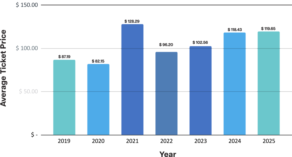 The healthy 50.5% increase in average tickets sold between 2019 and 2025 indicates how many artists are playing in larger venues and that demand is strong. Though this year’s slight 2.1% drop could augur a contracting market.
