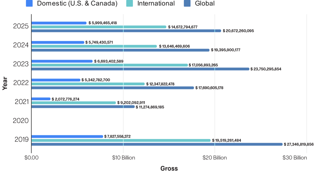 People did not flock back to movie theaters with the same enthusiasm that music and theater fans did once COVID restrictions were lifted. In fact, what you see from this Comscore data is that global box office has not exceeded pre-pandemic levels as other alternatives, such as streaming services available at home, have grown considerably as viable alternatives. The “global” category is a combination of U.S., Canada and international markets.