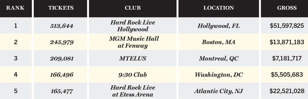 Hard Rock Live Hollywood in Hollywood, Florida, topped Q3’s club chart with 513.6K tickets sold Boston’s MGM Music Hall at Fenway follows with 245.900 tickets sold and then Montreal’s MTELUS with 209,000. Washington, D.C.’s 9:30 Club, part of Seth Horowitz’s regional I.M.P. empire in the nation’s capital follows with 166.400 and then Atlantic City’s Hard Rock Live at Etess Arena with 165.400. In terms of gross Hard Rock Live Hollywood far outpaces any other club venue with $51.6 million haul.
