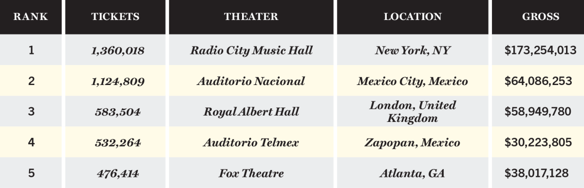 Another MSG property, New York City’s Radio City Music Hall tops the Q3 theater chart with 1.36 million tickets sold. Offering both seasonal family fare and major concerts, the iconic 1932 building continually tops our theater survey along with Mexico City’s Auditorio Nacional (1.24 million tickets), London’s legendary Royal Albert Hall (583.500), Zapopan, Mexico’s (532,000) and Atlanta’s Fox Theater (476.400).
