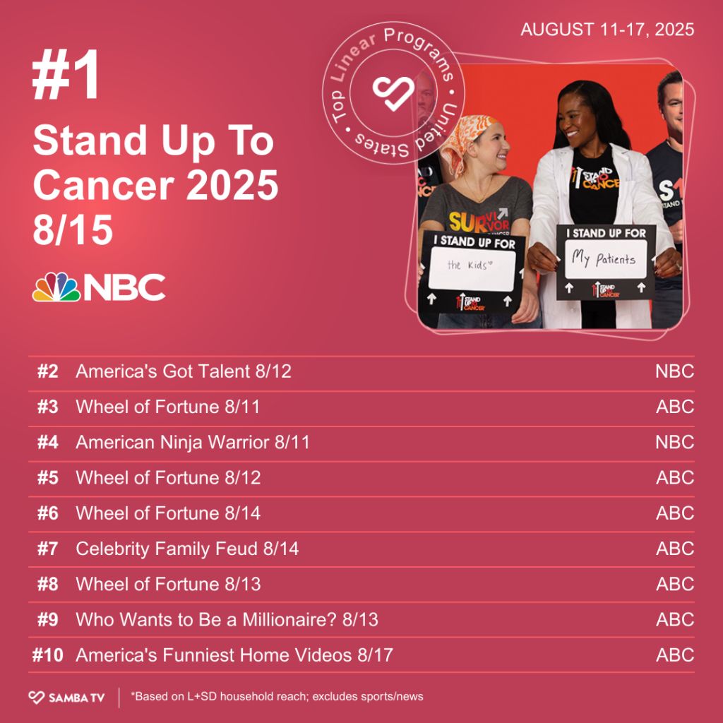 Over on linear, the annual “Stand Up To Cancer” fundraiser tops the chart this week. Dozens of celebrities shared their time on NBC on Friday, Aug. 15 to help raise money for the charity.