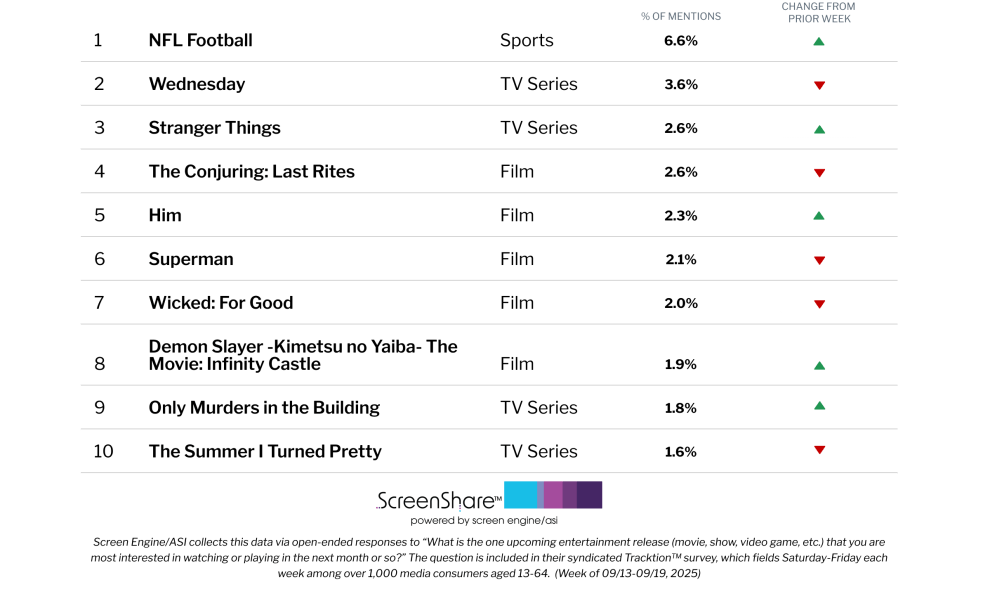 ScreenShare, a data partnership between Screen Engine/ASI and TheWrap, tracks the Top 10 most-mentioned entertainment options every week and whether each has gained or lost momentum compared to the prior week. The chart lives on the Data & Analysis page of the WrapPRO Members Hub.