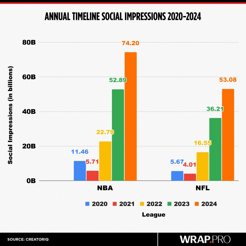 According to CreatorIQ, both social engagements and impressions for the NFL and NBA have increased exponentially since 2020. The NBA had over 74 billion social impressions in 2024, and the NFL garnered over 53 billion. Sports fans are consuming content on social media more than ever before.