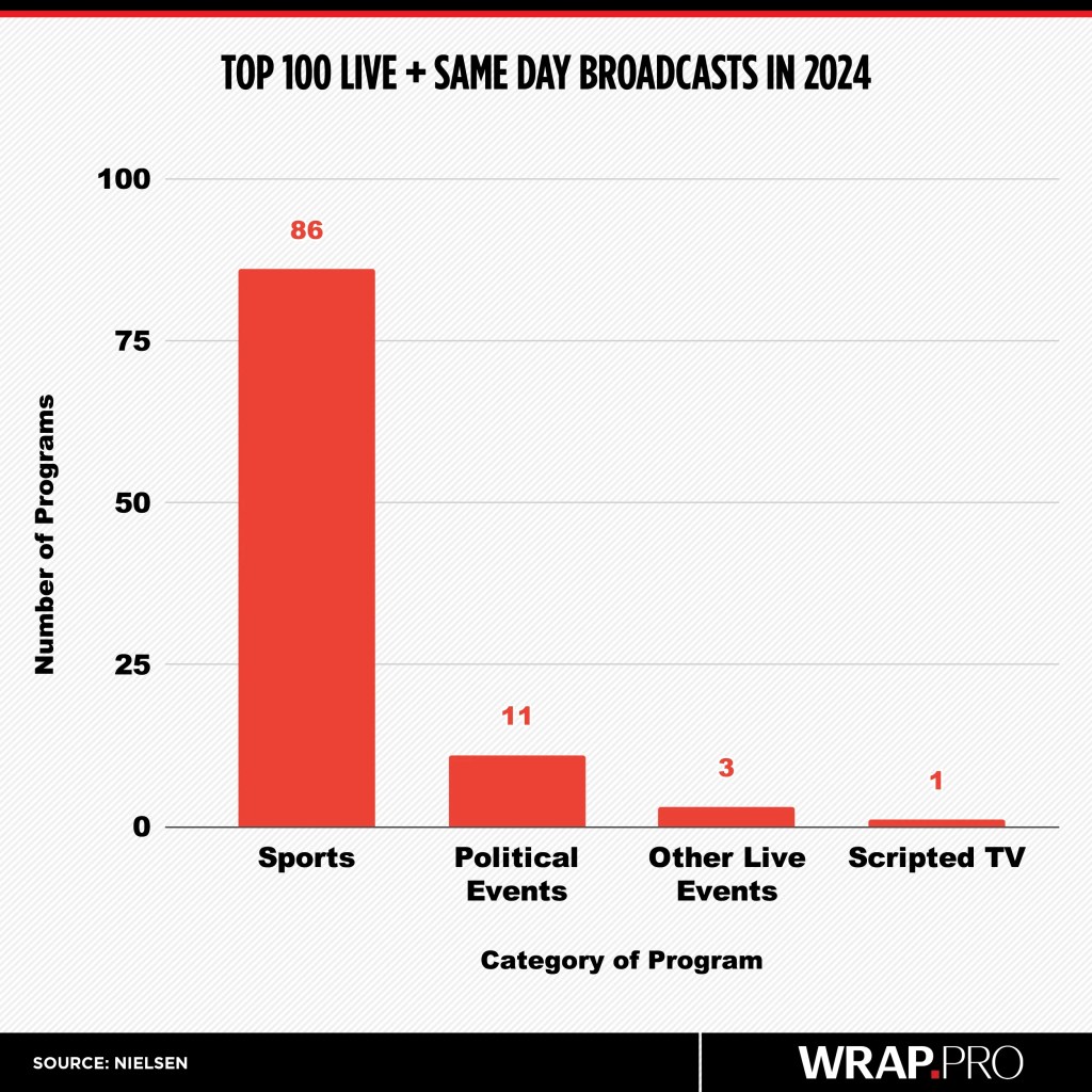 Sports accounted for 86 of the top 100 telecasts in 2024 in terms of live-plus-same-day viewing, according to Nielsen, with the balance made up of presidential debates, award shows, a few live events and the first episode of “Tracker,” which premiered after the 2024 Super Bowl.